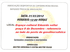 Olá amigos; neste sabado dia 31/3 as 12:00 hrs no Espaço Cultural Eduardo Soltur, praça 8 de Dezembro ao lado do posto de gasolina estará acontecendo o Batizado e Troca de Cordas do Grupo de Capoeira Rosa Baiana do Mestre Chebinha e C Mestre Edson.